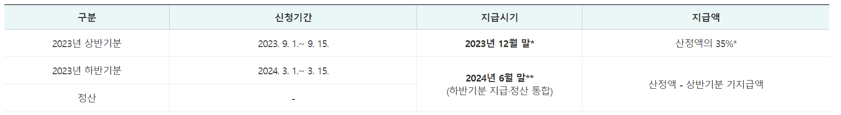 - 정기 지급방식과 반기 지급방식 중 선택하여 신청이 가능합니다. ( 반기 신청은 기한 경과 후 신청 불가 )