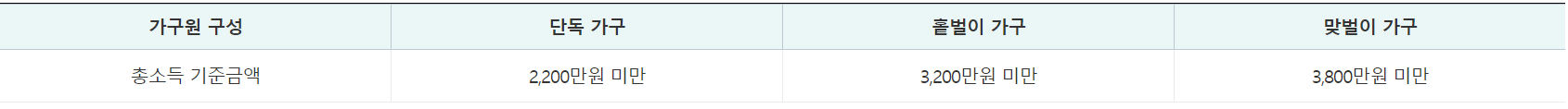부부합산 연간 총소득 합계액 및 연간 근로소득 합계액이 가구원 구성에 따라 정한 총소득 기준금액 미만이어야 합니다.
